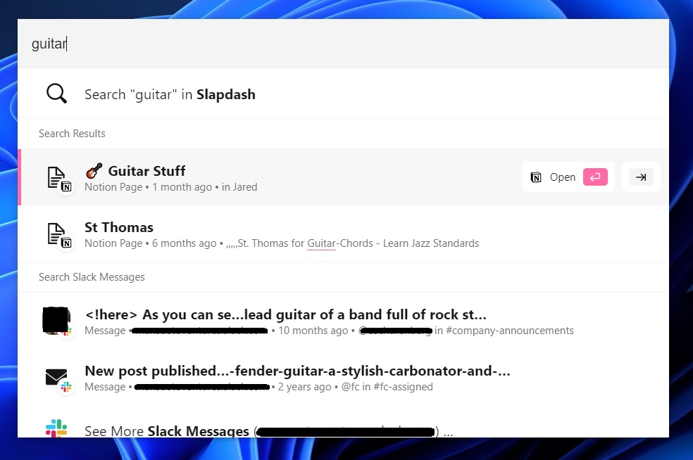 The last option to check out is Slapdash, a relative newcomer for both Windows and Mac that feels like a more polished version of Alfred's Workflow concept. Instead of searching through local files, the app can interact with online services like Notion, Slack, Dropbox, and Google Calendar. Just press Ctrl-J or Cmd-J, and you can search your notes, files, conversations, upcoming calendar events, and more, all in one place. (You can connect five of these apps for free, or more with a $12 per month subscription.) |
