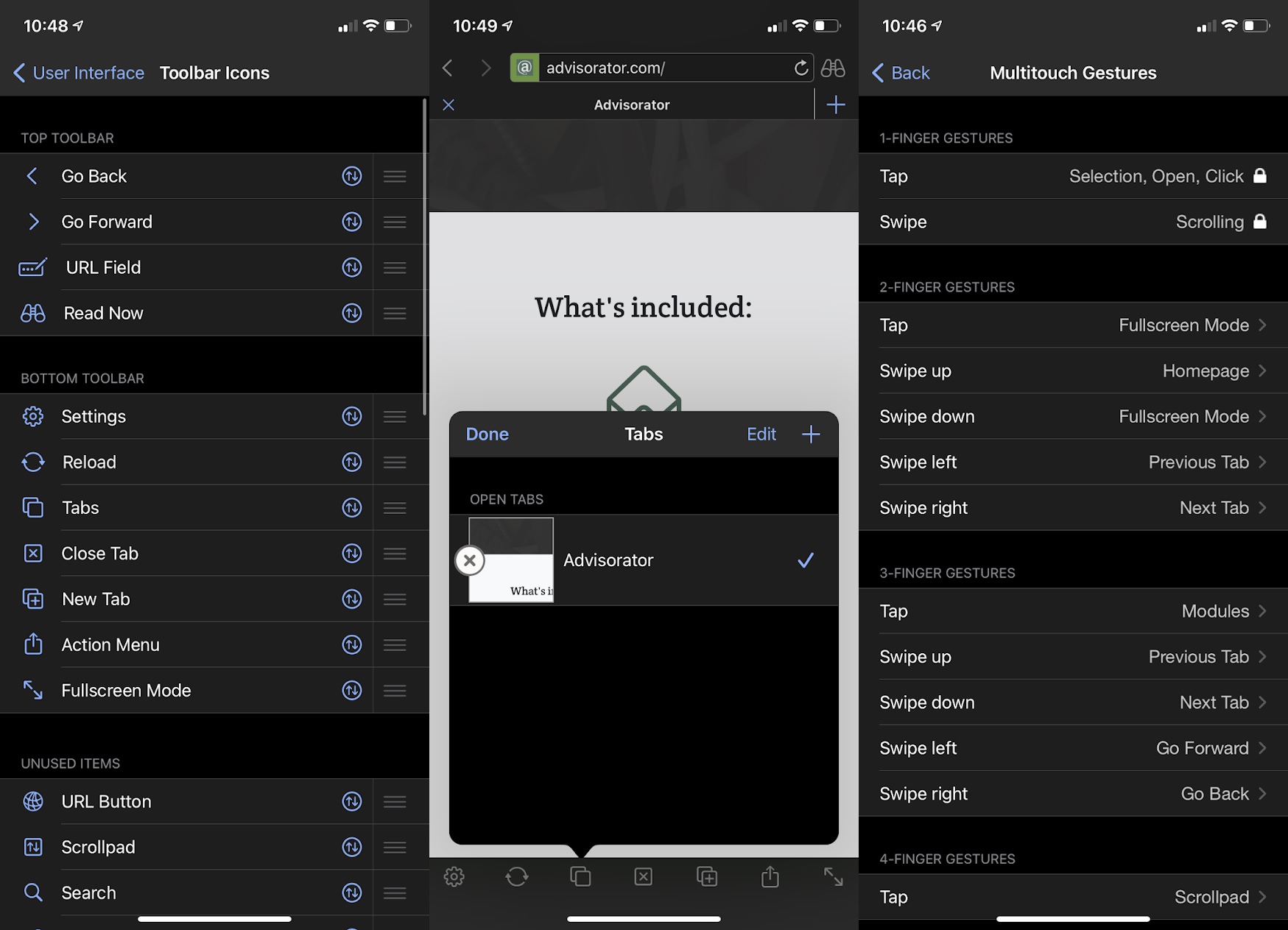 iCab Mobile: What Vivaldi is for desktop browsers, iCab is for iPhones and iPads. Practically every element of this mobile browser is tweakable, from the buttons in the top and bottom menu bars to what happens when you open a new tab. You can also set up custom multi-touch swipe shortcuts, add quick commands when you tap on a website's icon, and customize your new tab page. Perhaps my favorite feature, though, is the ability to switch between full-screen and menu bar views with the tap of a button. (While most of the apps here are free, this one costs $3.)