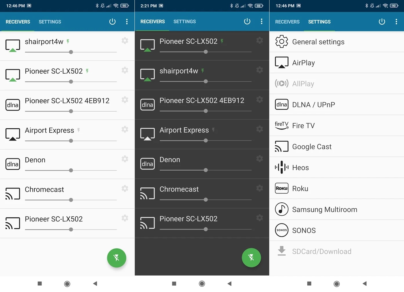 When you launch AirMusic, it will automatically detect Sonos, Google Home, Samsung Multiroom, AllPlay, Heos, AirPlay, and DLNA devices, and you can optionally enable streaming to Fire TV and Roku players as well. The app can then record any audio playing on your phone and re-stream it to all those devices at the same time. (If you have a rooted Android device, this recording step is not necessary.)