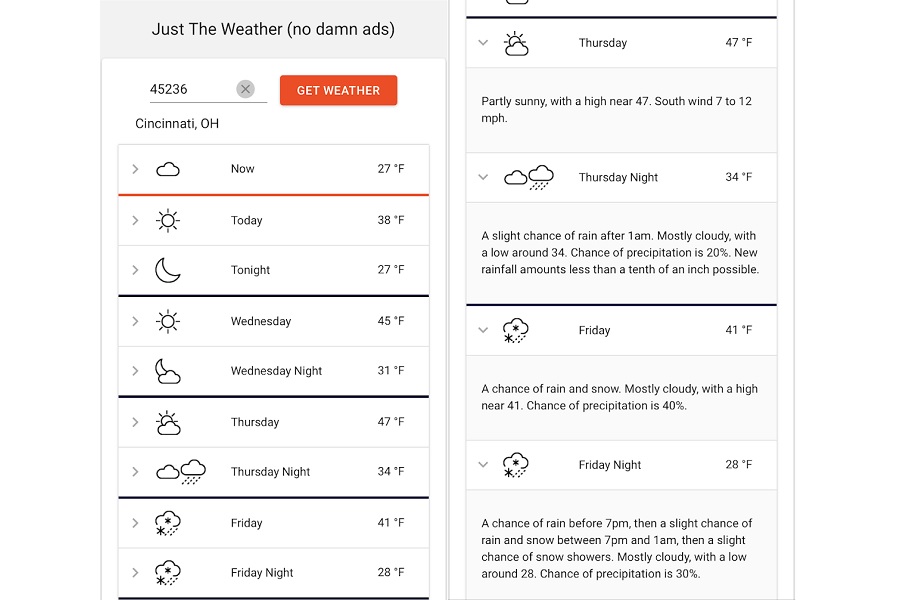 While most weather apps overwhelm you with information, Just the Weather presents you with a simple readout of weather conditions, temperatures and wind speeds for the next seven days. Data comes from the National Weather Service—in fact, the forecast descriptions are identical to what you'd find on weather.gov—and as the site's tagline suggests, there are no ads to contend with.