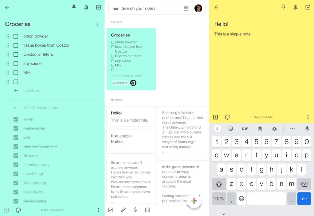 My wife and I also use Google Keep for our shared grocery list. With its Google Assistant integration, we can ask any nearby Google Home or Nest speaker to add an item to the list, usually right after realizing we've run out of something. |