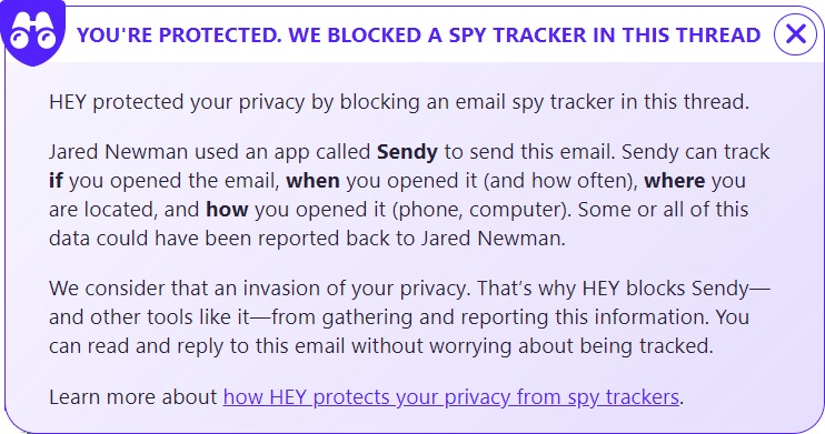 Perhaps most notably, Hey is aggressive about calling out email trackers. When a sender tries to track you, the app shows a binoculars icon next to their name and a message at the top of the email: "You're protected. We blocked a spy tracker in this thread." Clicking on the message lists all the information the tracker tried to collect, and states outright that Hey considers tracking to be an invasion of privacy. For me, it's been fascinating to see how many PR people and even personal contacts are doing it.