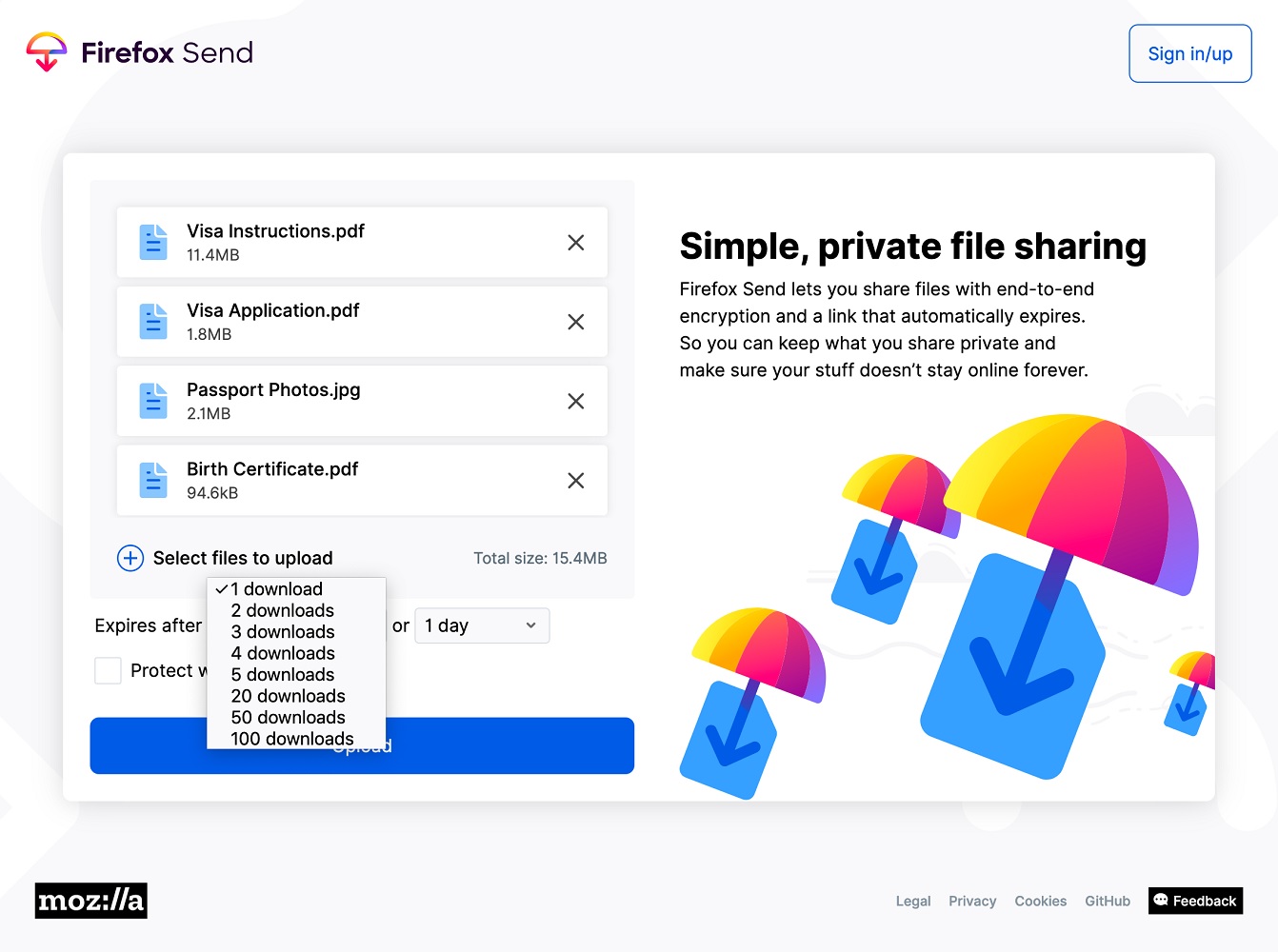 Compared to email, Firefox Send is safer because it encrypts your files between you and the link recipient, so not even Mozilla can see what you're sending. You can also set the link to expire after a certain amount of time or certain number of downloads, and there’s an option to password-protect your files as well. Those options make Firefox Send ideal for sending ID card scans, tax forms, or other sensitive documents that you wouldn't want lingering in someone else's inbox.